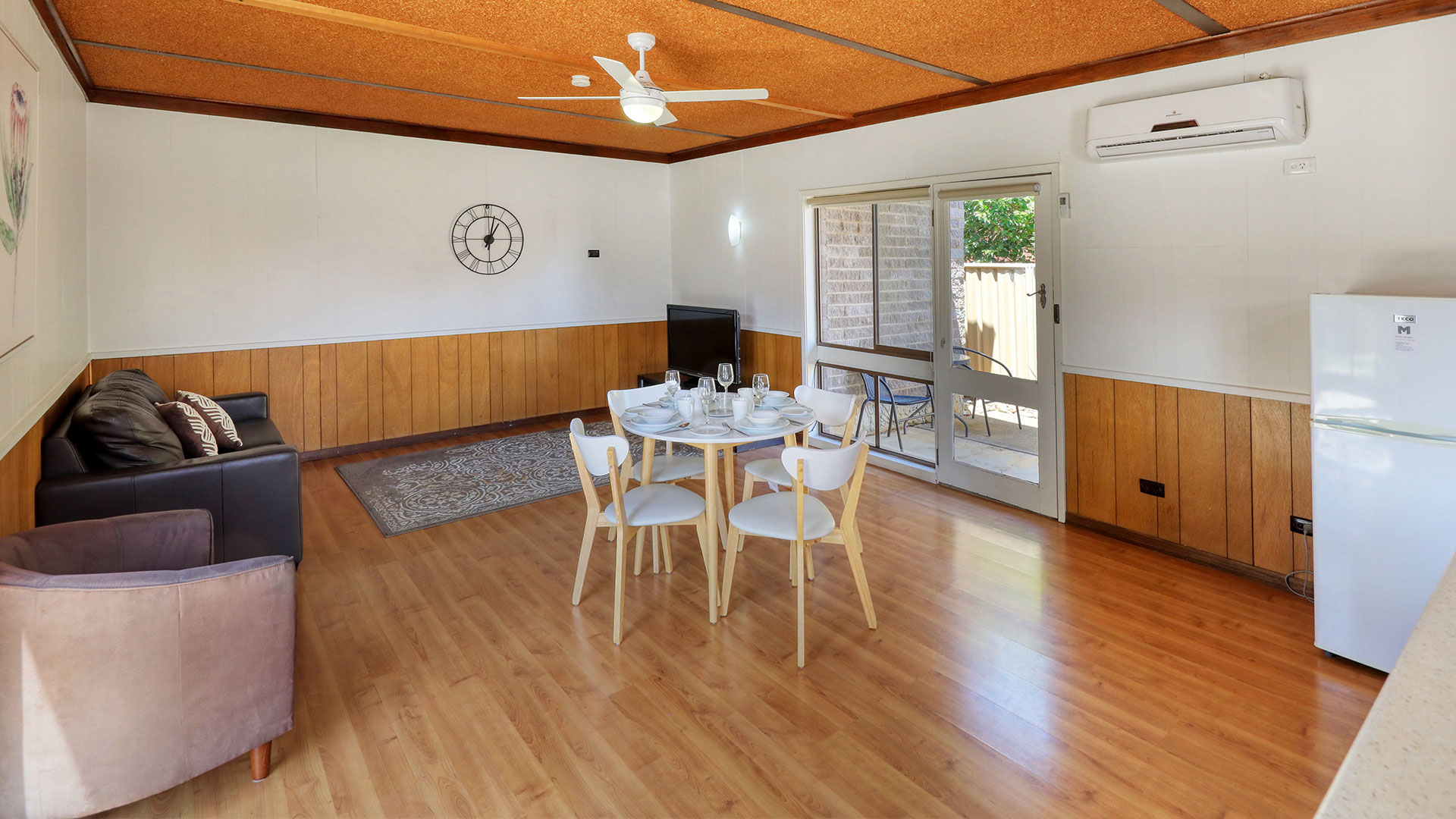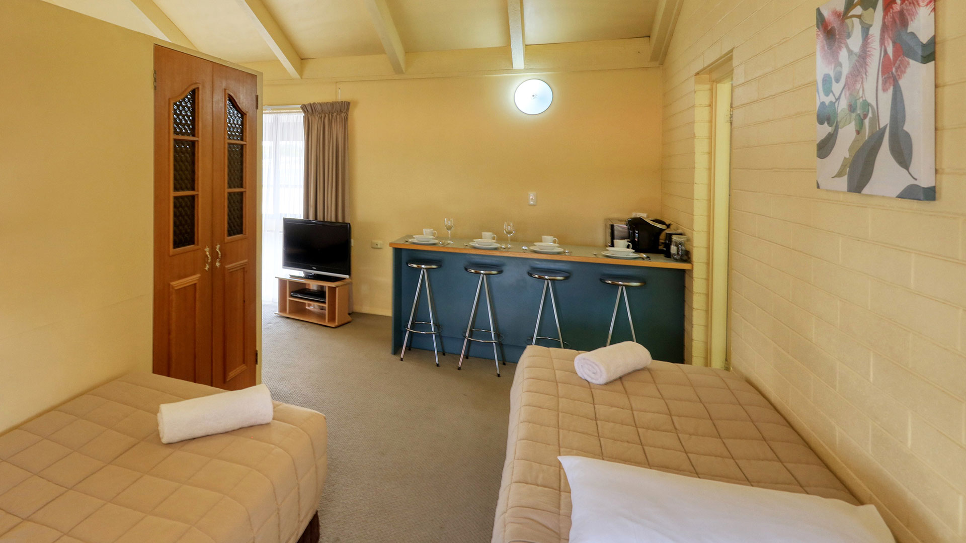 microwave | bar fridge | toaster | cutlery | crockery